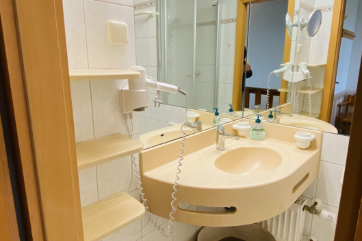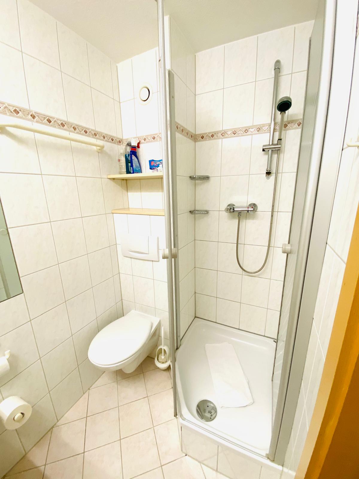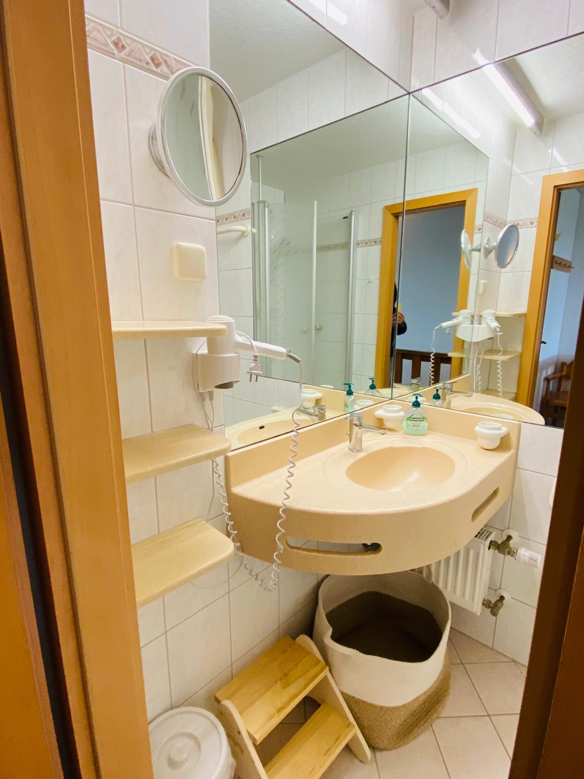 Das kleine gemütliche Bad ist ein einladender und funktionaler Raum, perfekt gestaltet, um trotz seiner begrenzten Größe Komfort und Stil zu bieten.